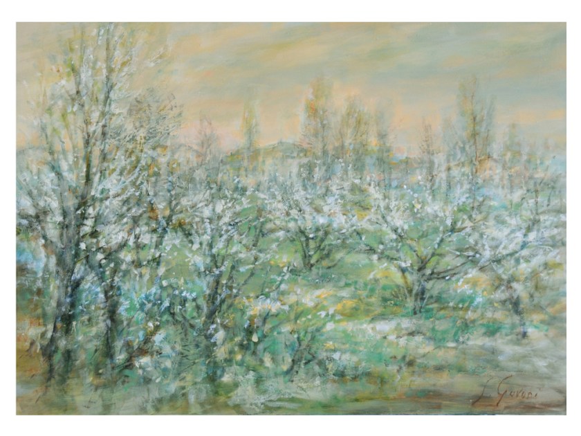 Luce diffusa e sobria traspare;piante e casolari lontani, pruni in fioritura spandono essenze, in primo piano piante spontanee e sfrondi.