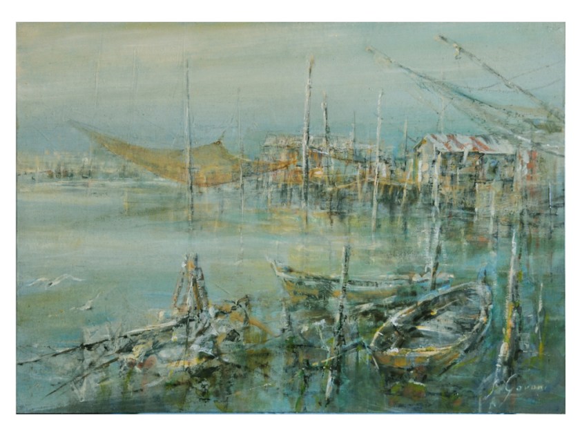 Gli ambienti di pesca nei canali del basso ferrarese: attracchi, reti, pali, capanni e pontili costituiscono intrichi ricchi di spunti pittorici.